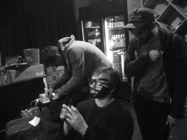 we got to the airtport and hit the air slept and arrived within the first 5 minutes of getting in the airport cops took us to one side as a sniffer dog had smelt something on us (which of course we diddnt have) and then they took us to a back room and interegatted us and made us undress and spread against the wall this is the first time any of us have undressed infront of men and we found it odd and unpleasant but once they found out we were good boys we left and went and met rolf who was driving us to the festival we got dropped off at the apartment we were being put up in and hung out for a bit then off we trotted to the festival we had some fish and potatos and began drinking people from the other bands (who were mainly metal bands) proceeded to come up and talk to us one told us he was heavily affiliated with the jam scene this was not our bag so we decided to go watch a band. I diddnt know who the band was but crikey were they frightning all dressed up in black with their hair flowwing down what a spooky look they looked like real life monsters.